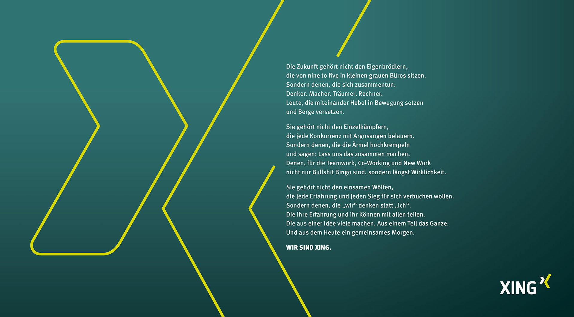 Ein X das verbindet – Wir nutzen einen Teil des XING Logos als grafische Klammer, als Rahmen, der verschiedene Menschen verbindet. Dieses grafische Element symbolisiert die Idee „Wir sind XING“ auf elegante Weise und verleiht der gesamten Kampagne gleichzeitig eine hohe Wiedererkennbarkeit.